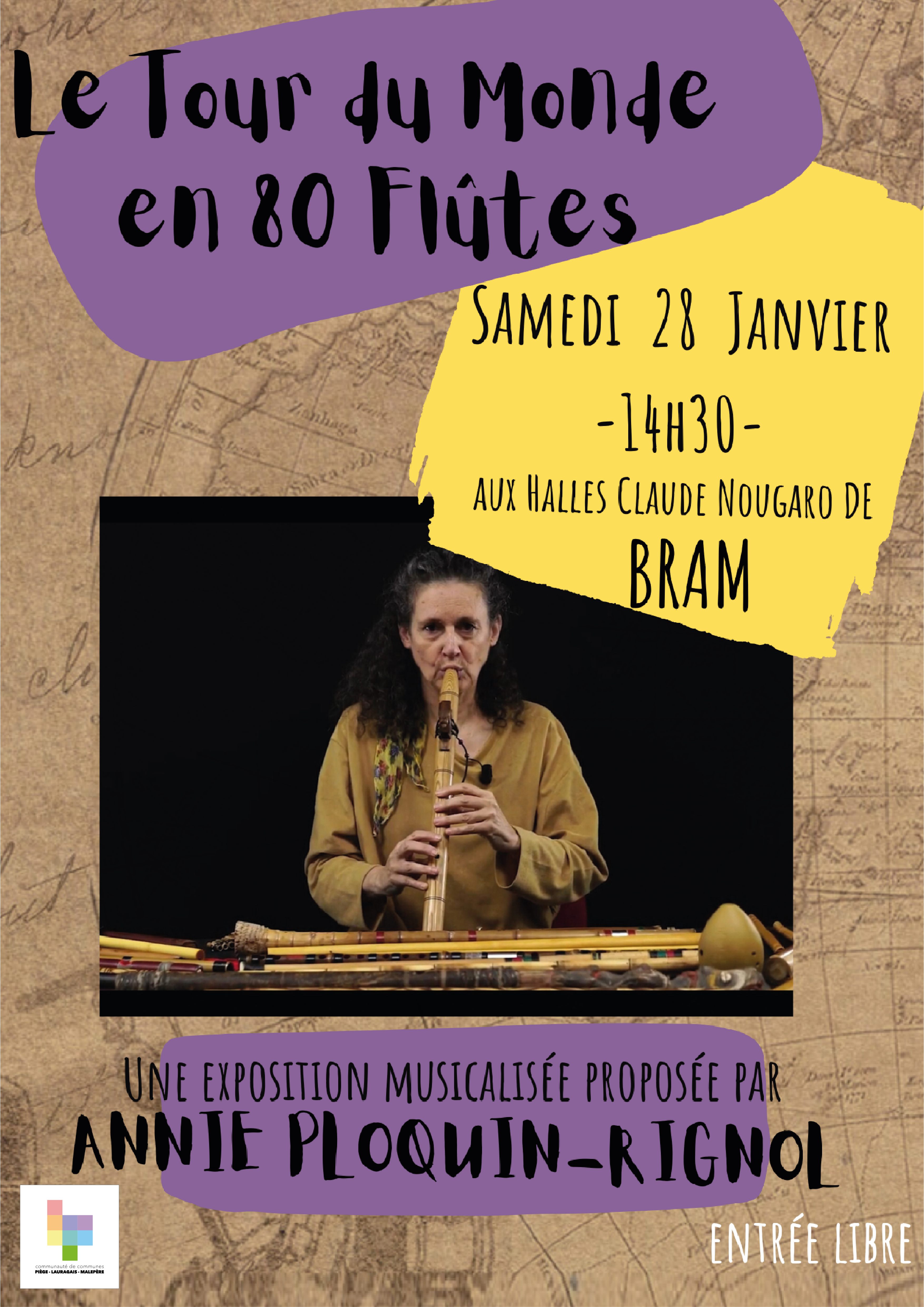 Dans le cadre d’une master class de flûtes regroupant les instrumentistes audois ce samedi, l’école intercommunale des arts de la CCPLM accueille une conférence musicale « Le tour du monde en 80 flûtes d’Annie Ploquin-Rignol ce samedi 28 janvier à 14h30, Halles Nougaro à Bram.