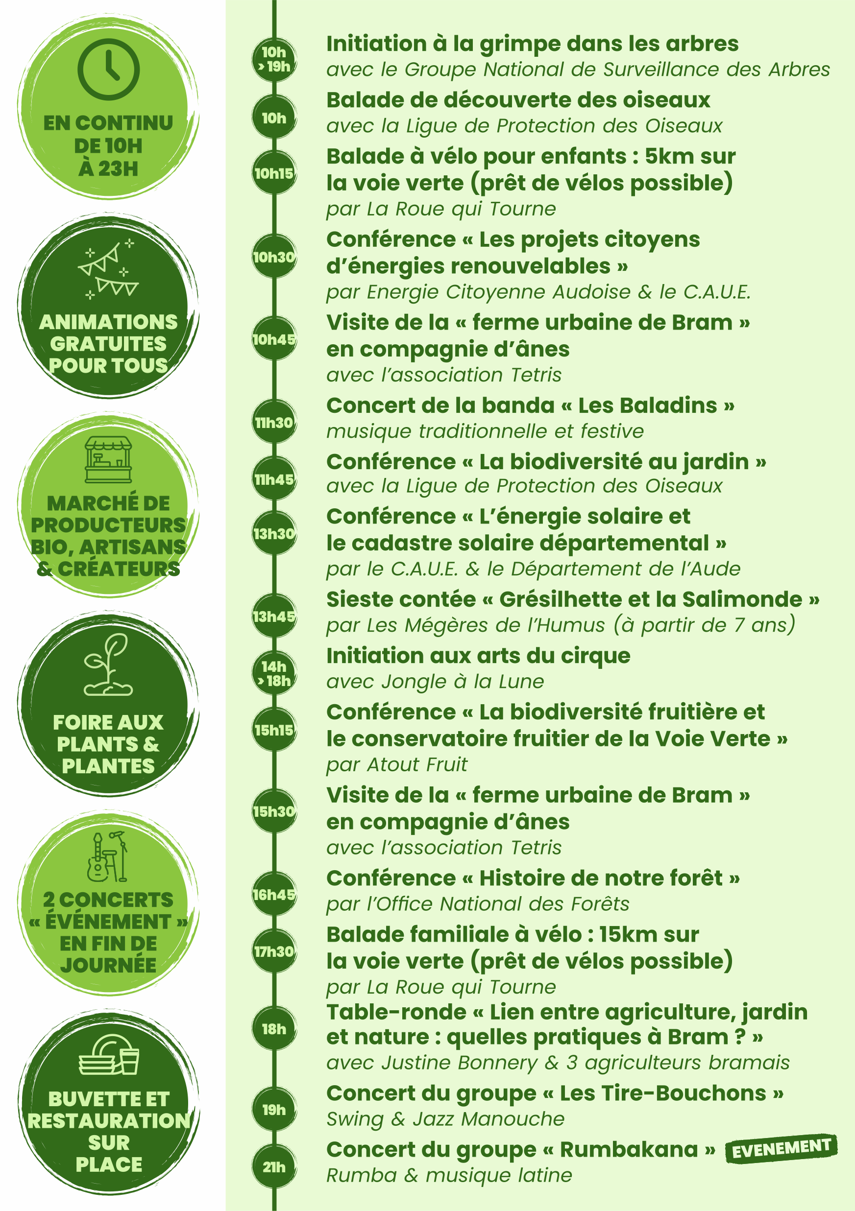 En partenariat avec la CCPLM, la mairie de Bram vous convie à la « Fête de l’environnement » qui se déroulera le SAMEDI 25 MAI de 10h à 23h dans le Parc des Essars à Bram.