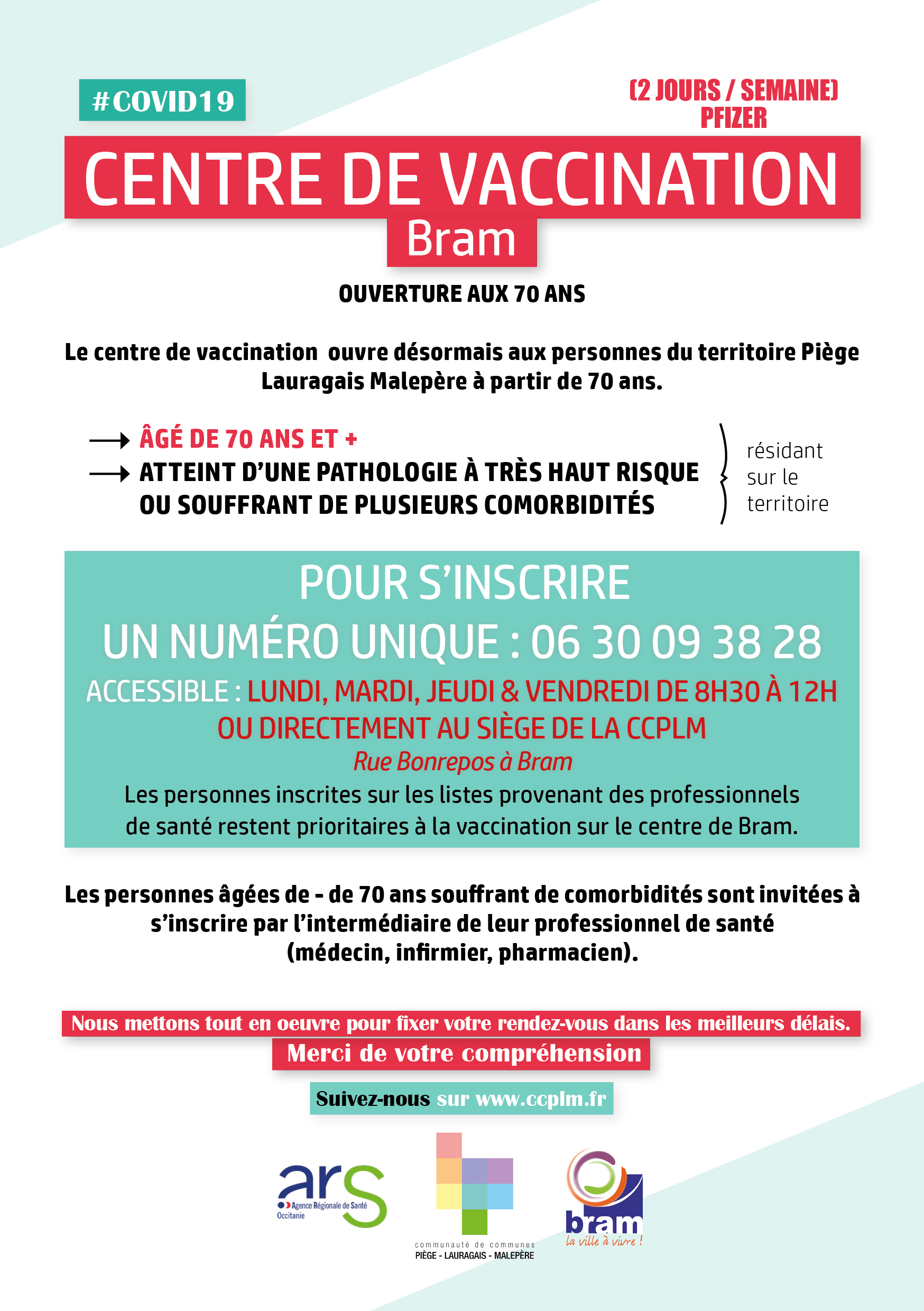 Le centre de vaccination, porté par la CCPLM, ouvre désormais aux personnes du territoire Piège Lauragais Malepère à partir de 70 ans directement par téléphone 06 30 09 38 28 auprès des agents de la CCPLM les lundi, mardi, jeudi et vendredi de 8h30 à 12h ou directement au siège de la CCPLM à Bram. A noter, les personnes inscrites sur les listes provenant des professionnels de santé restent prioritaires à la vaccination sur le centre de Bram.