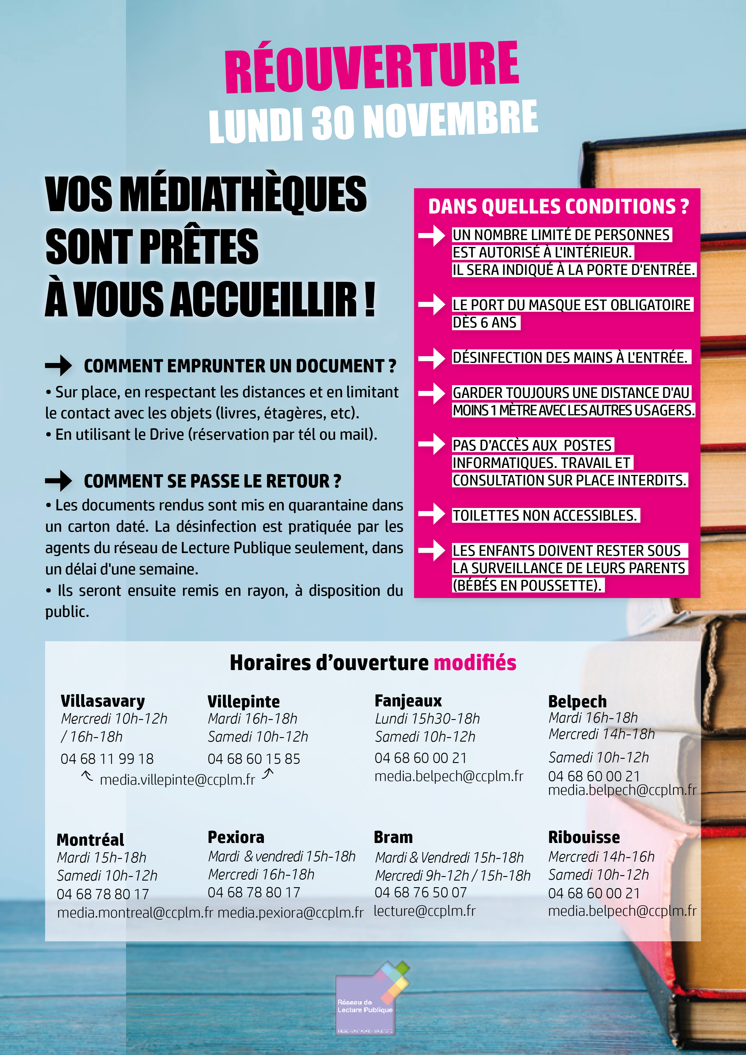 A partir de lundi 30 novembre, vos médiathèques rouvrent au public, dans le strict respect des conditions sanitaires décrites ci-après. Bien sûr, la réservation par téléphone ou mail sera toujours possible pour un retrait en drive. Les horaires d’accueil sont également modifiés.