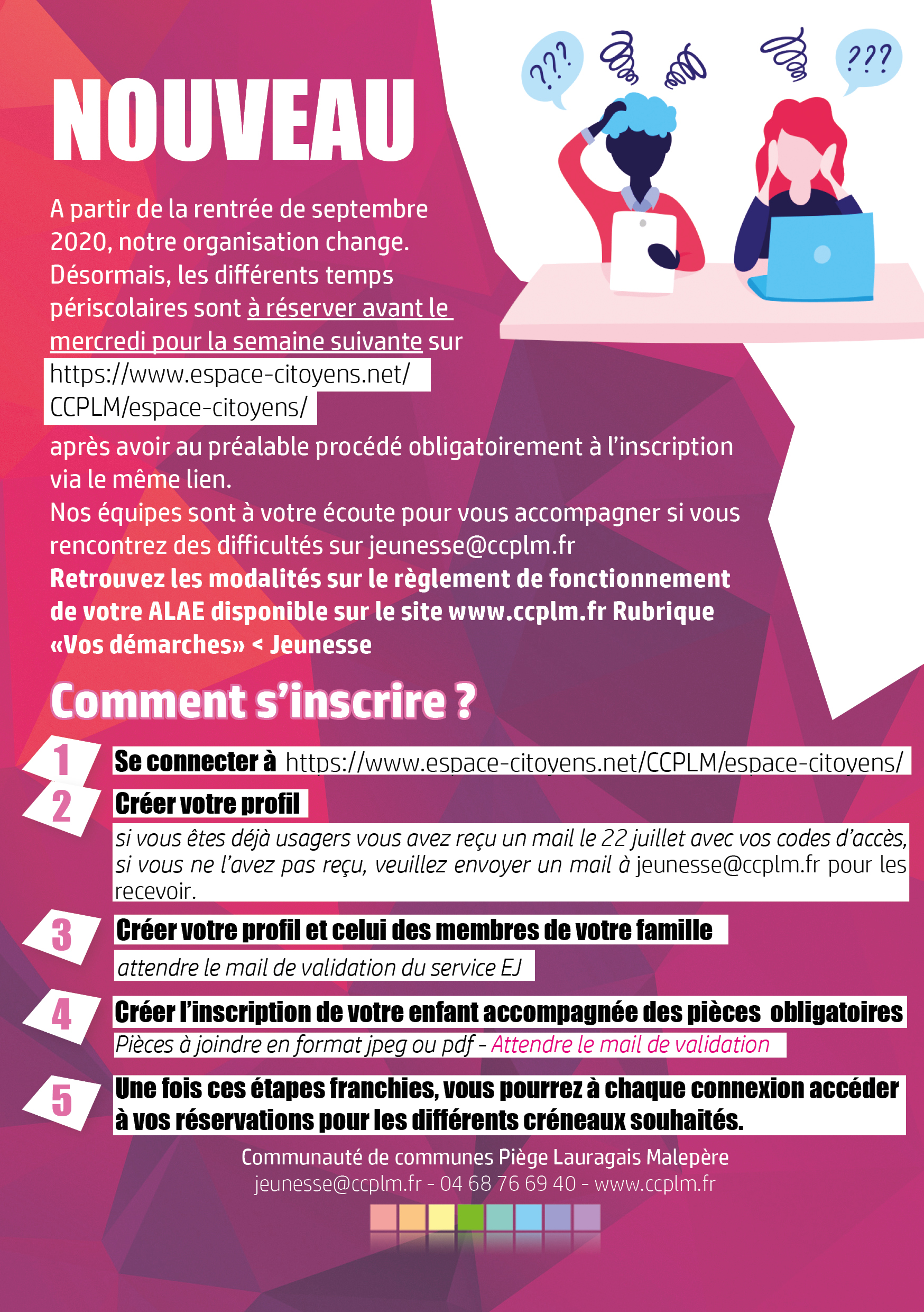 Inscription et réservation aux accueils de loisirs associés à l’école (ALAE) uniquement via jeunesse@ccplm.fr